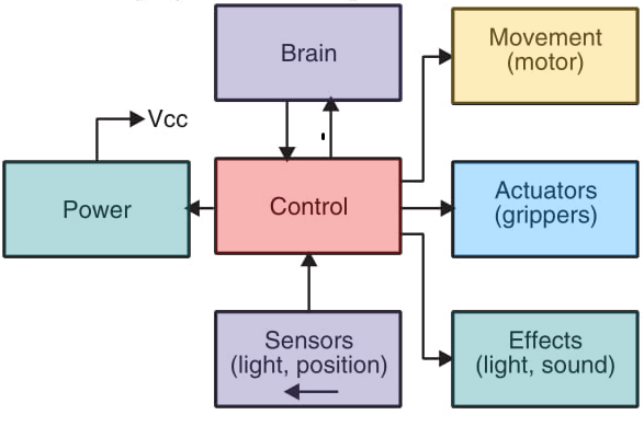 Control. The signals for this block can be sent by the operator (via radio control, IR link, or a cable), or they can be generated by sensors engaged by the moving system (motor, wheels, tracks, or legs). If the robot has other movable parts (e.g., arms or a head), they can be controlled by this block.