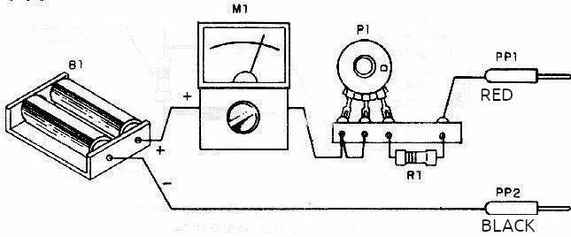 There is no need to use a printed circuit board given the reduced number of components used. Any microammeter with a full scale of 100 uA to 400 uA can be used. Observe the polarity of the instrument when turning it on, because if it is reversed the needle tends to move in the opposite direction to what is expected. To use, simply touch the test leads to the component or circuit under test and observe the needle of the instrument. Never use the tester on circuits that are working. The power supply to the circuits under test must be turned off and, in the case of components; they must be disconnected from the circuits in which they are used.