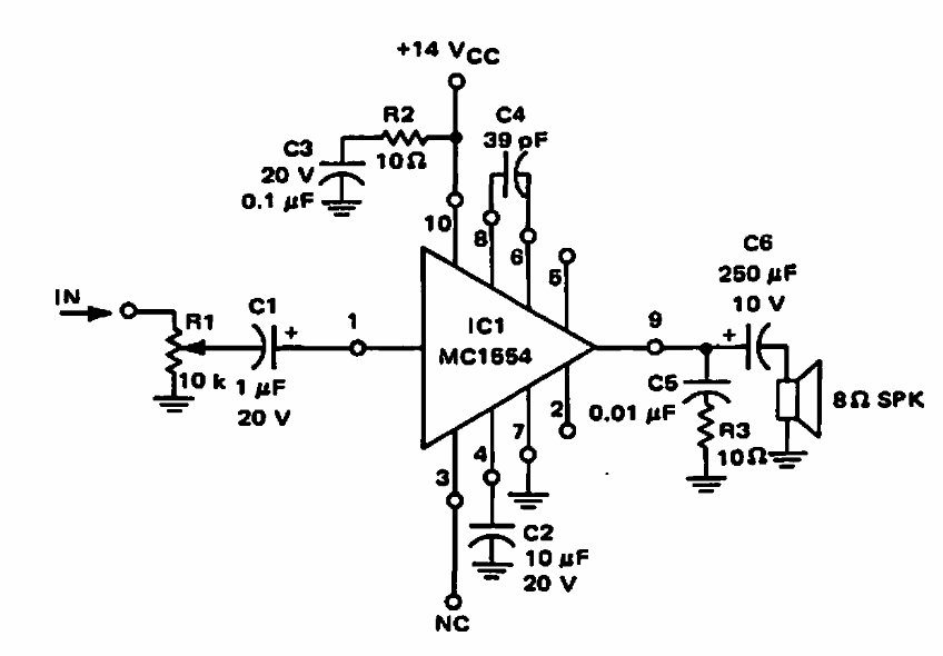 Using a Motorola MC1684 integrated circuit this 1968 amplifier provides 1 W to a 8 ohm load. The response ranges from 20 to 20 000 Hz and the distortion is only 1% at 1 kHz.