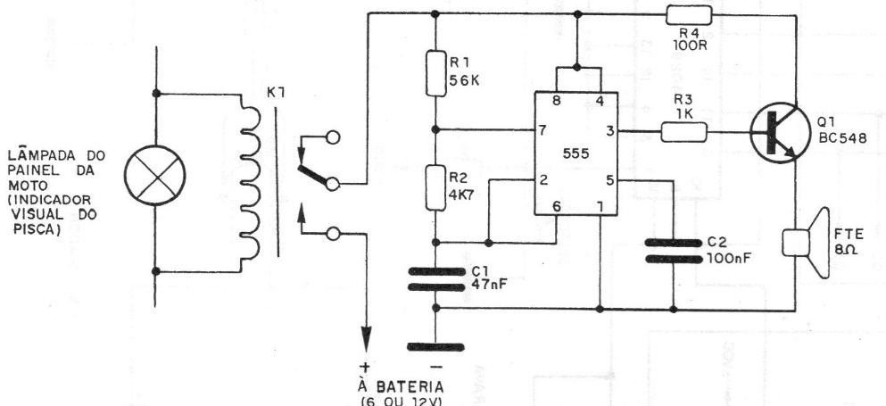 We found this simple warning circuit for car blinkers (arrow) in a 1987 publication. The relay must be 12 V and the sound can be modified by changing R1 and R2 for other values. The loudspeaker is of the small type of 8 ohms and the power is taken from the car itself.