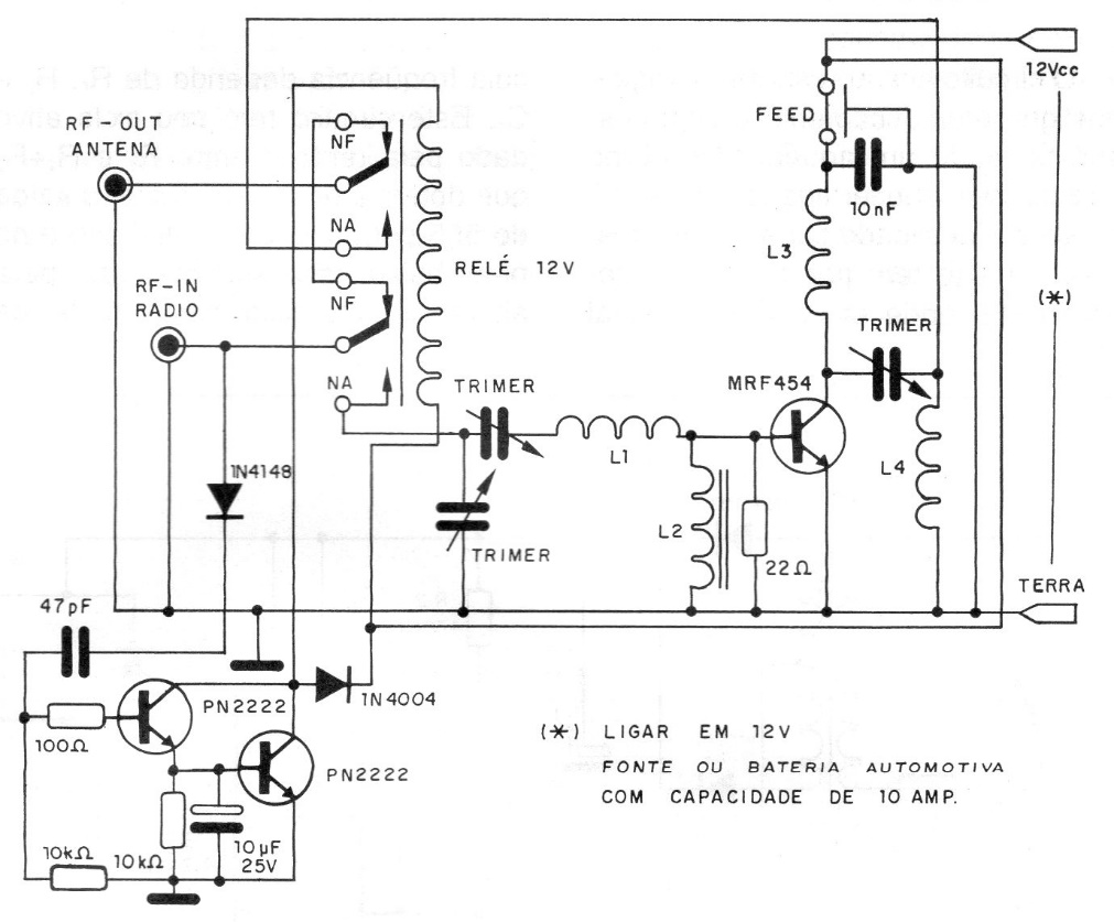 With the used coils and the power transistor this circuit amplifies the 5 W of a 11-meter transmitter to obtain a power of approximately 60 W. The circuit is from 1995 documentation and L1 is formed by 3 turns of wire 18 with 1 cm internal diameter and 1 cm long. L2 consists of 17 turns of wire wrapped in a ballpoint that results in a length of approximately 1.3 cm. L3 has 12 turns of wire 18 in the shape of 1 cm and L4 has 4 turns of wire 18 in the shape of 1 cm.
