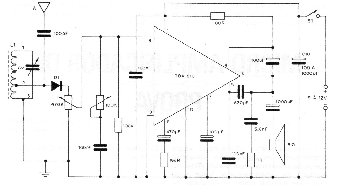 The integrated circuit used in this 1982 project is not very common today. It can be adapted to use more modern amplifiers, taking advantage of the tuning and tone control circuit. The coil consists of 15 + 75 turns of enameled AEG 26 to 30 wire on a ferrite rod. The supply must be made from a source, given the high consumption of the circuit.