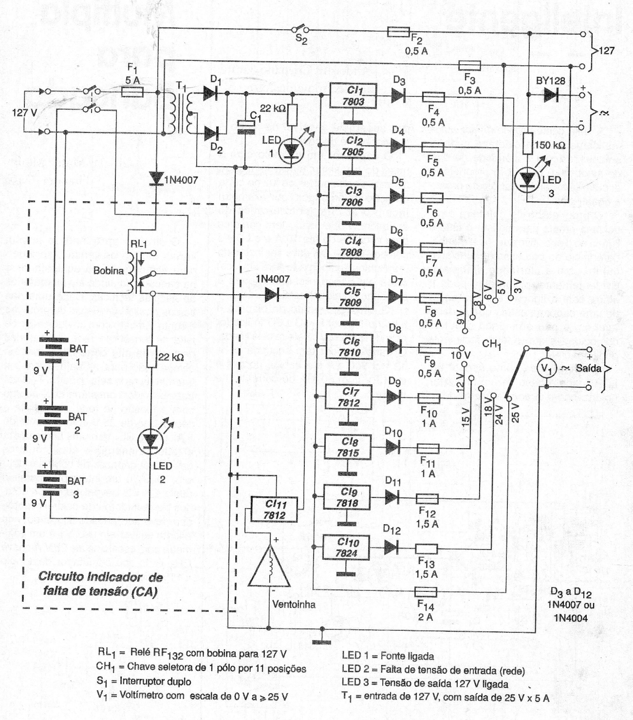 This power supply, found in 2002 documentation, uses fixed 1 A regulators for the power output. The circuit is practical, although it uses too many components, which could be replaced by a more economical configuration. The circuit also has the option of using an external battery.