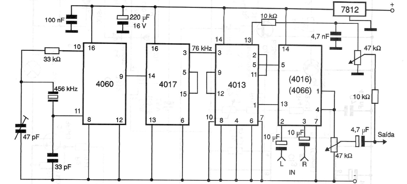 This circuit encodes the two channel signals from an amplifier for a multiplex-stereo transmission. The circuit works with any transmitter and the signals applied are of low intensity, such as those obtained at the output of mixers and preamps. The 15 V supply must have excellent filtration and the circuit includes a 12 V regulator.