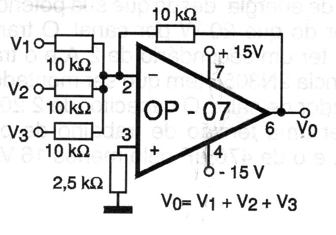 Adders appear several times on this site with operators of all types. In this circuit the output voltage is the sum of the input voltage, since as it does not exceed the supply voltage. The source must be symmetrical for the circuit to operate with negative voltages and other operational ones can be used.