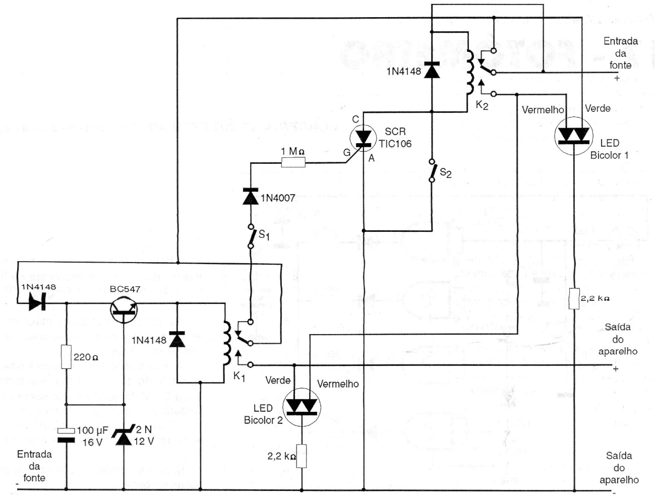 We found this circuit in a 1997 documentation. It can be used in any common 12 V source and has two relays that disconnect the source in the event of a short circuit.