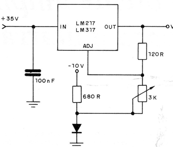 This circuit allows regulating voltages from 0 V under currents up to 1.5 A. With the LM350, currents up to 3 A. can be regulated. The integrated circuit must be equipped with a heat sink.