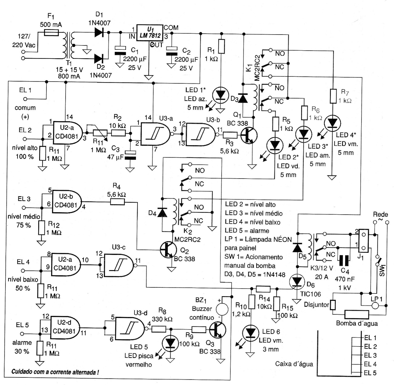 This is a reservoir level control project, in this case, using 4 sensors so that 4 different levels can be sensed with automatic pump activation at the lowest level and the indication by LEDs. It is a circuit that can be modified to work with different types of sensors, from the contact ones, as in this case, to the reed type, which leads to a wider range of applications. With reed sensors, for example, it can be used in an automation as a position sensor, and thanks to the sensitivity of the 4081 used, one can even think about using light sensors as LDRs.