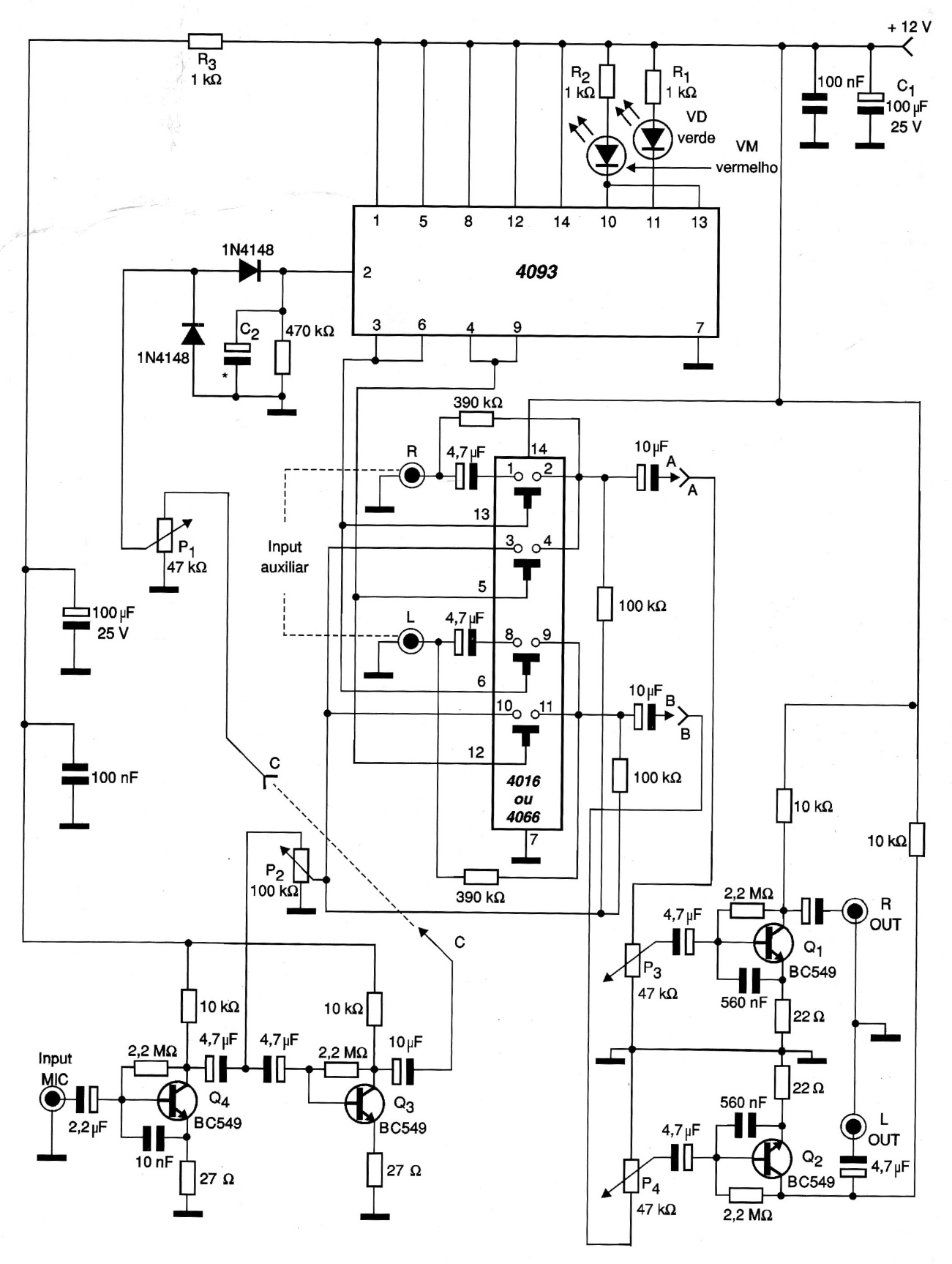 This circuit allows you to superimpose the signal from the microphone to that of the music with maximum volume, obtaining important effects in experimental stations or editing CDs. The circuit is from 2002 and has several controls. The food must come from a source with excellent filtration so that no snoring occurs.