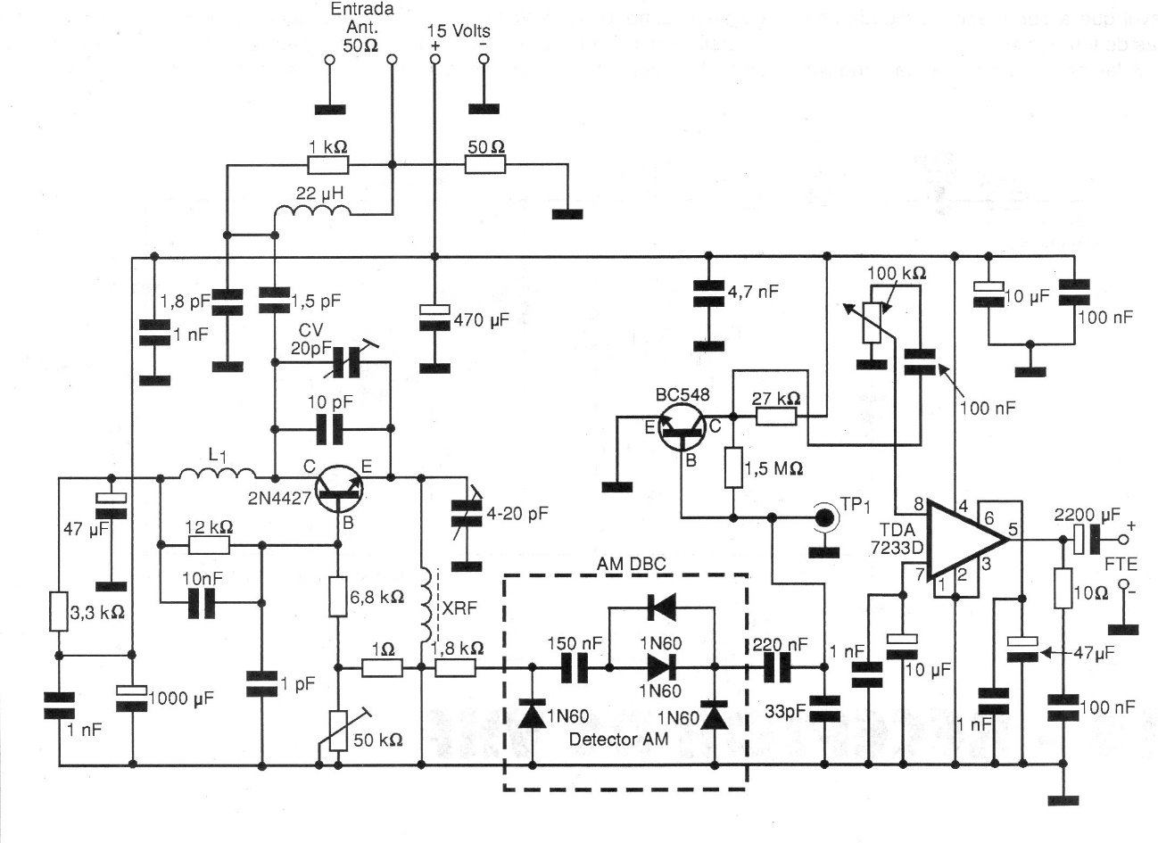 This circuit includes a power stage with an integrated circuit that is uncommon today. Equivalents can be used. L1 consists of 4 coils of wire 24 or 26 in the form of 1 cm without core. XRF is a shock formed by about 50 turns of wire 32 in a 100k x 1/8 W resistor. The power is provided by a 15 V power supply (CB17137E).