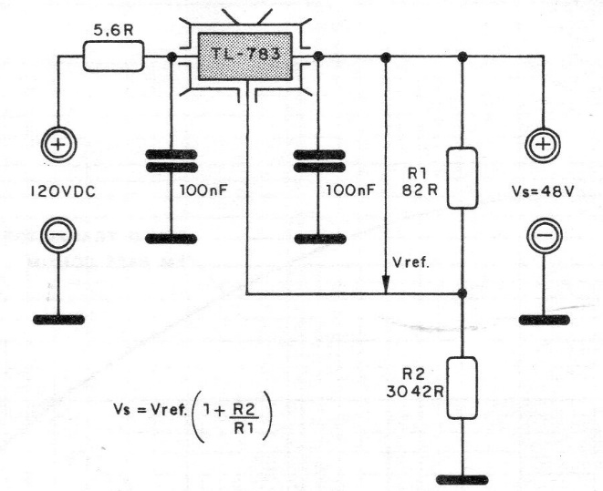 We found this circuit in Texas Instruments documentation from 1986. The circuit produces a regulated voltage of 48 V used in telephone equipment at the time. The integrated voltage regulator must have a good heat sink. The maximum output current is 1 A.