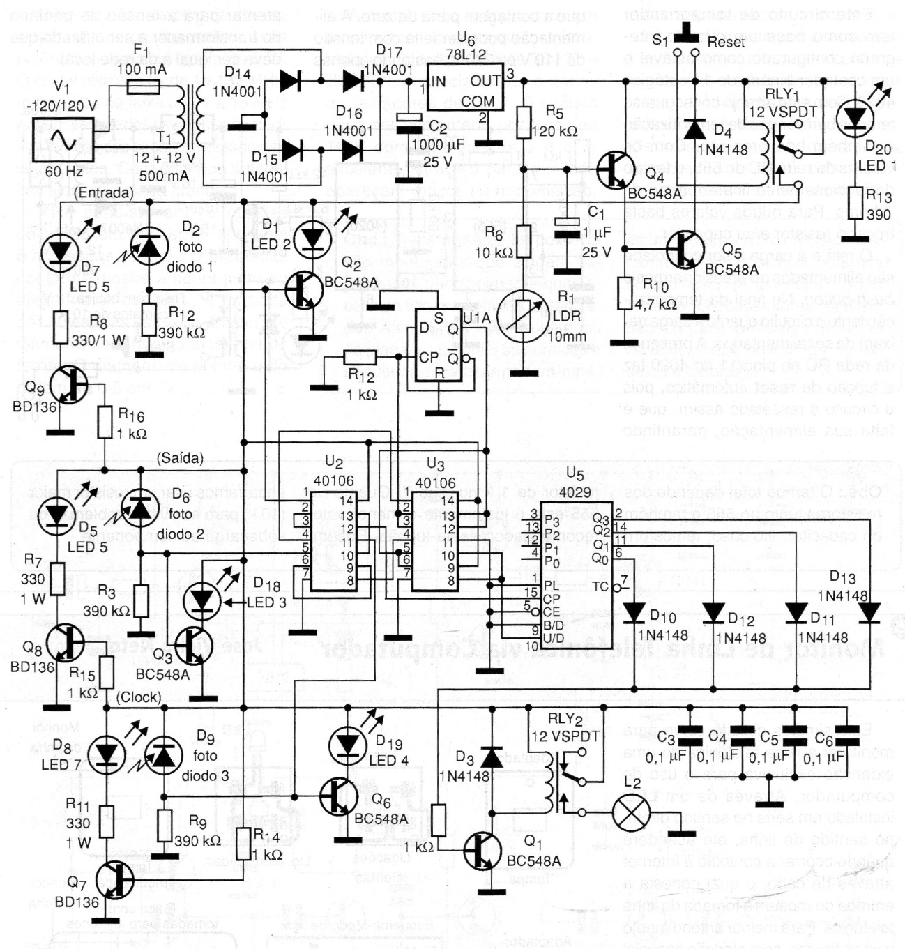 It is a circuit that automates the lighting of a specific location (bedroom, living room, kitchen, bathroom, hallway, etc.). As it is an event counter, the system keeps its output in the on state if there are people (up to 15) in the room. When one passes and cuts off the first beam of light (pair of LED and input photodiode), the counter is incremented by one. If more than one person (or more) passes through the same beam of light, the counter is increased by another unit. Likewise, as soon as a person passes through the third beam of light (LED pair and output photodiode), the counter is decremented by one and so on. The second beam of light (LED pair and clock photodiode) is the clock pulse that is sent to the counter and events.