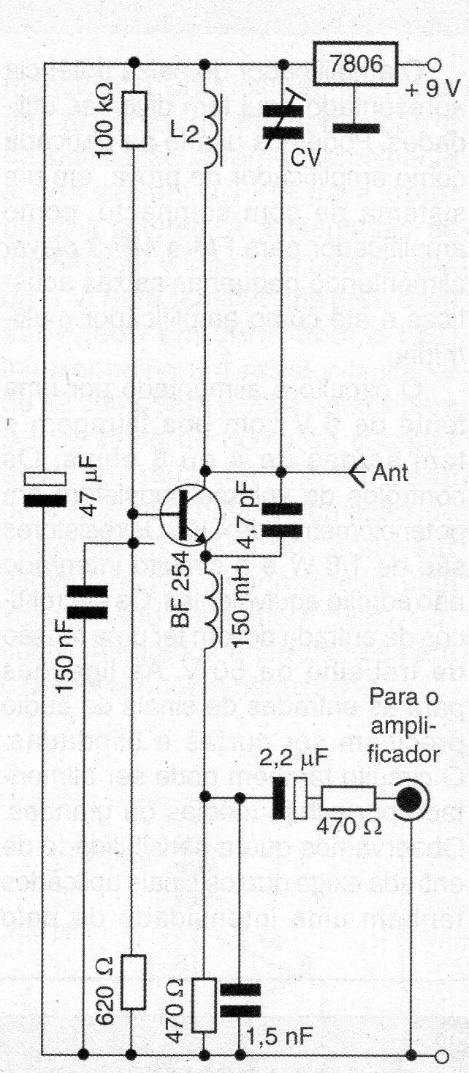 This circuit was originally indicated to receive the signals from CIR1178. However, it can be used to receive signals from any FM receiver. The coil consists of 4 turns of 24 or 26 threads in the form of 1 cm without core. The antenna is of the telescopic type and the power can also be made with 4 batteries, in addition to the indicated source.