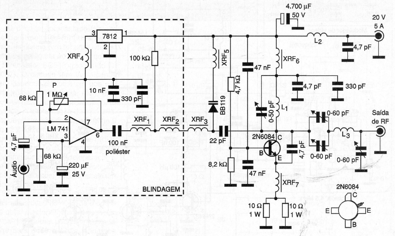 The range, of course, also depends on the antenna and local geographic conditions, remembering that there are legal restrictions on the use of this type of equipment. The connections between the components must be as short as possible and the plate must be made of fiberglass. The RF shocks have the following characteristics: XRF1, XRF2, XRF3 and XRF5 consist of 150 turns of enameled wire 32 in the form of ferrite 1 cm in diameter with 2 cm in length. XRF4, XRF6 and XRF7 consist of 6 turns of wire 22 in ferrite of 1m in diameter with 2 cm in length. The coils have the following characteristics: