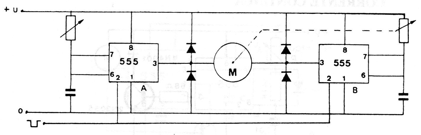 In the figure we have a circuit that uses two 555 to control the positioning of a servo motor. The potentiometer used depends on the type of motor and is mechanically coupled to the motor shaft. Potentiometers have typical values between 10k and 470k and capacitors between 47 nF and 470 nF.