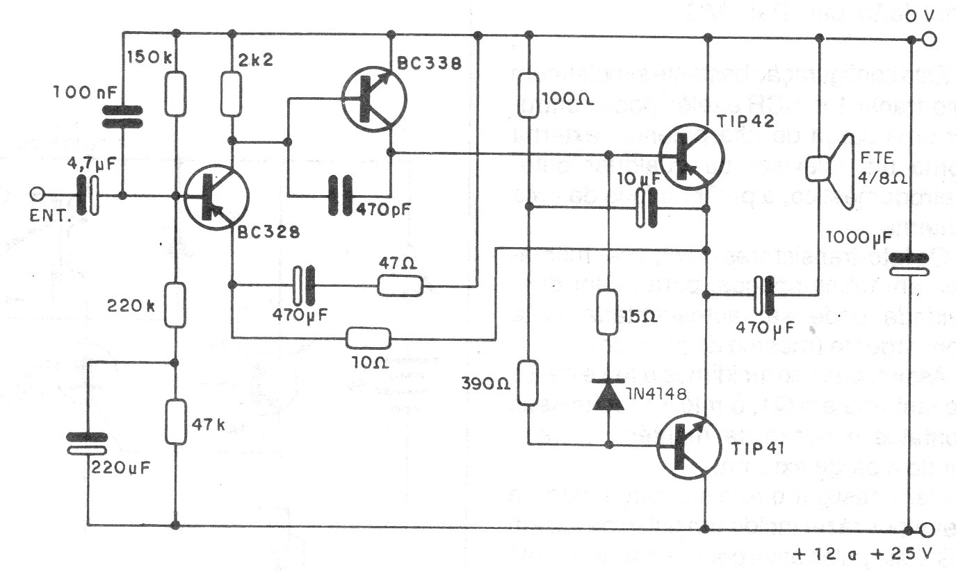 This traditional complementary configuration is from 1990 documentation. The transistors must have a heatsink and the source must supply at least 1.5 A of current. Maximum output power is obtained with a 25 V power supply.