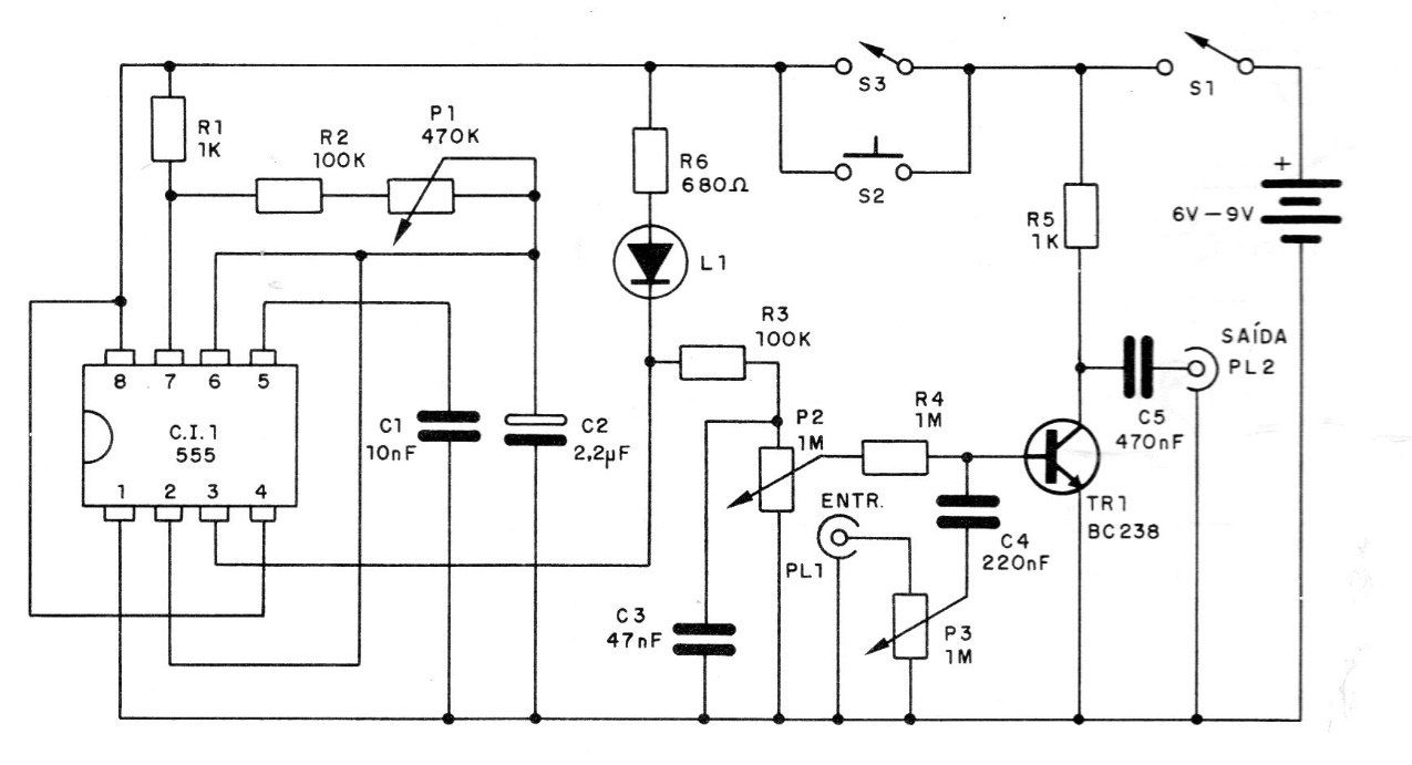 This circuit was found in a 1986 publication. The speed of the effect is determined by the 555, being adjusted in P1. The circuit has several adjustments, such as intensity of the effect and attenuation of treble.
