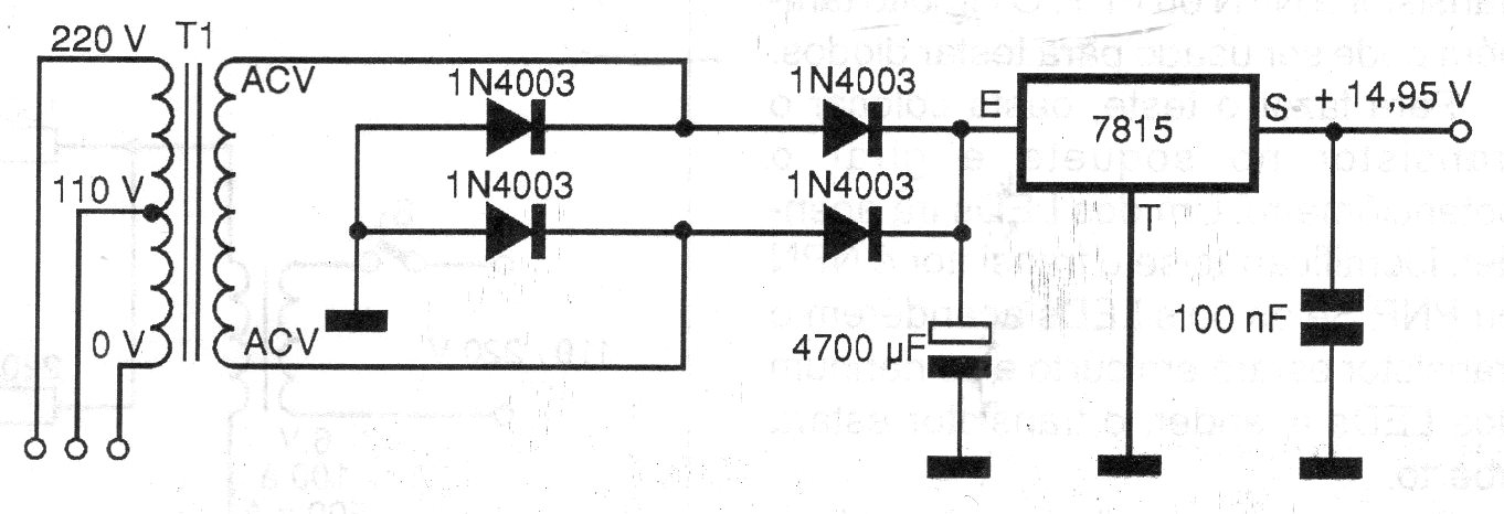 This simple power supply is based on the 7815 integrated circuit, which must be mounted on a heat sink. The diodes can also be 1N4002 or 1N4004 and the transformer has 12 + 12 V or 15 + 15 V x 1 A.
