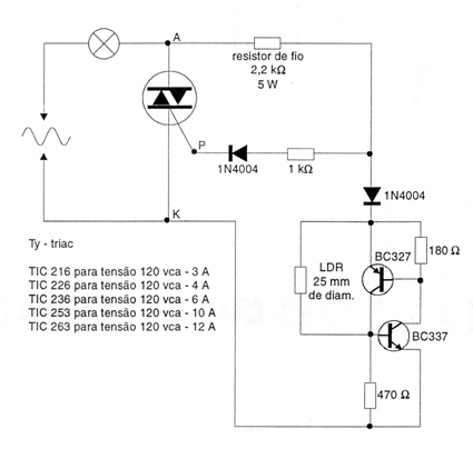 This circuit activates an incandescent garden, balcony or showcase lamp when it gets dark, turning it off at dawn. This circuit is from a 1998 publication and only works with this type of lamp. The triac must be equipped with a small heat sink and 220 V triacs can be used if the supply is made with this voltage, increasing the wire resistor to 4k7.