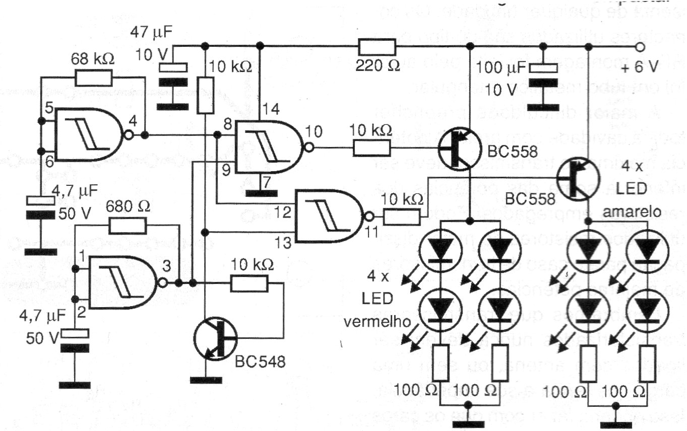 Many people currently use the bicycle as a means of transportation and leisure in large cities. However, unfortunately still, for several reasons, there are few public roads that have cycle paths and with that cyclists end up sharing the lane with larger vehicles. The simple circuit presented allows to alert, through a light signal, the presence of a cyclist and his bicycle. For this purpose, four high-brightness LEDs are used, which are already quite common in our market and which, especially at night, allow viewing from a good distance.