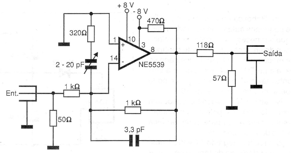 This circuit is based on an operational amplifier that is uncommon today, but that can reach the UHF range and that has its highest performance around 45 MHz. The circuit is from 1999 and must be powered by a symmetrical source.