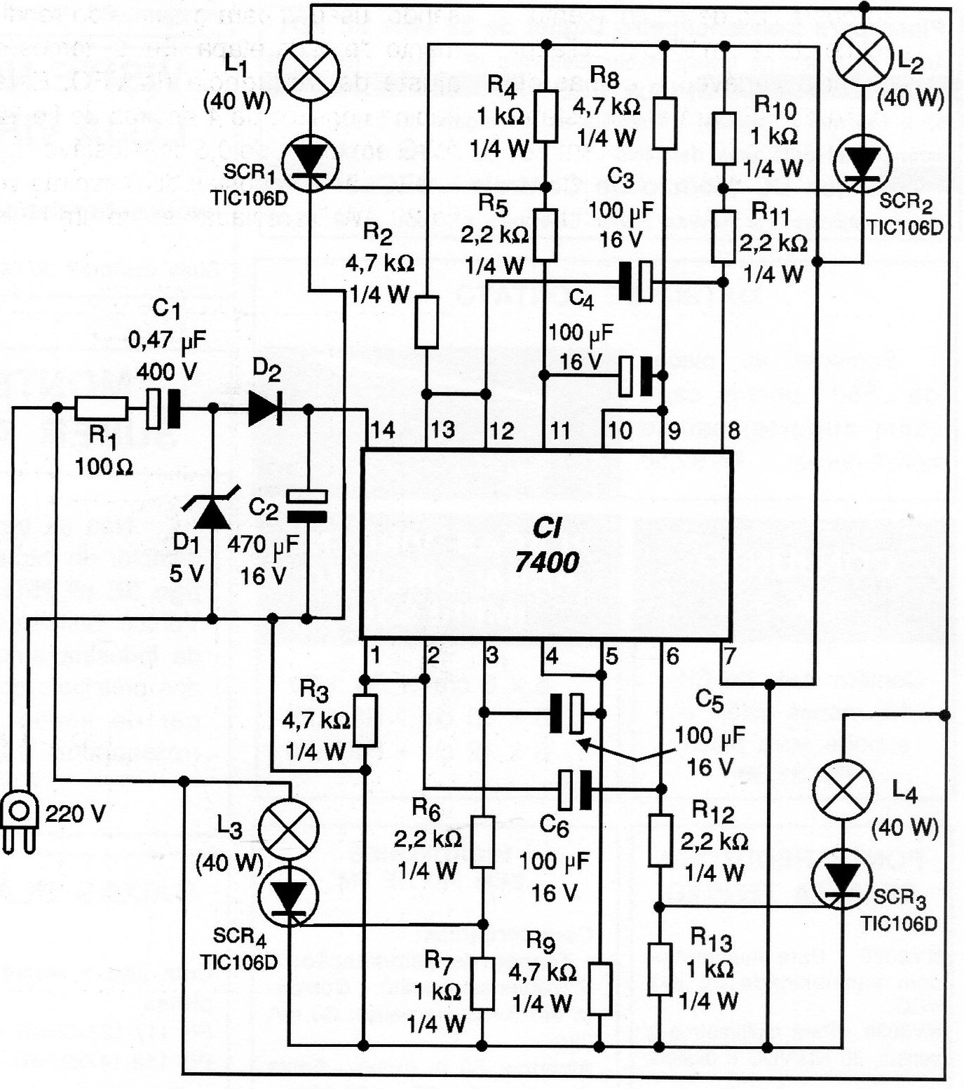 This circuit excites incandescent lamps by making them flash alternately. There are 4 outlets and lamps of another type should not be used. The circuit has a source without a transformer powered by the power grid. SCRs must be provided with heatsinks.