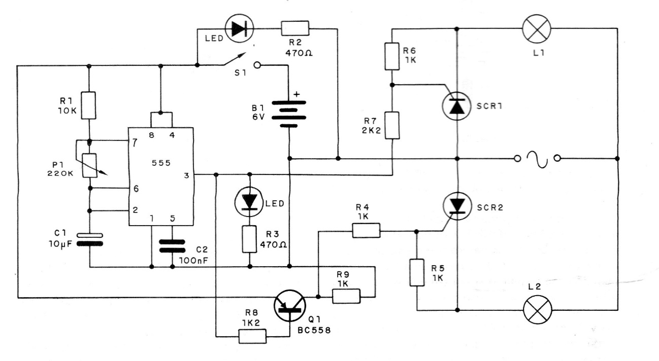 This circuit, found in a 1985 documentation, causes two incandescent lamps to flash alternately. The blinking speed is controlled in P1. The circuit uses a 6 V auxiliary battery (4 batteries), but a source can also be used.
