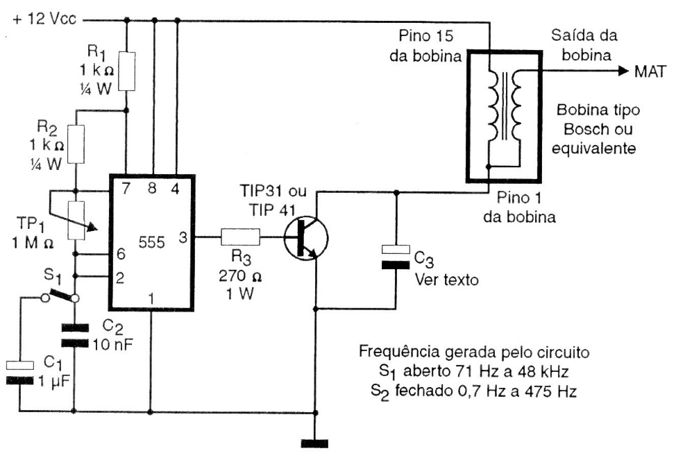 This very high voltage generator (VHV) uses a 555 and a power transistor with a heat sink. The circuit is from 1997, but still current, for using common components. The high voltage transformer is nothing more than an automobile ignition coil.