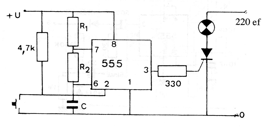 In the figure we show how to use a 555 to control an SCR or another type of thyristor. Resistors R1, R2 and C depend on the desired command mode and the supply must be between 5 and 15 V. The circuit is from an old documentation.