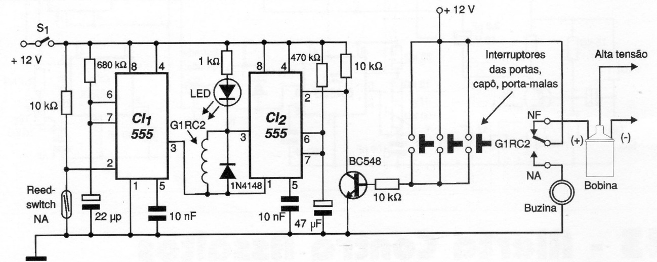 This circuit is from 2001 documentation but can still be used in some models of automobiles whose electronics can be easily accessed. The circuit prevents the current from reaching the coil and thus the vehicle work, and in addition, it triggers the horn.