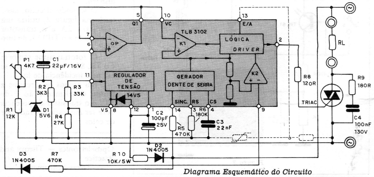 The integrated circuit, in this 1986 application, is not a very common component today. The circuit switches the load voltage from 110 V to 220 V or vice versa. The triac must have a heat sink and current according to the controlled load, which should preferably be resistive.