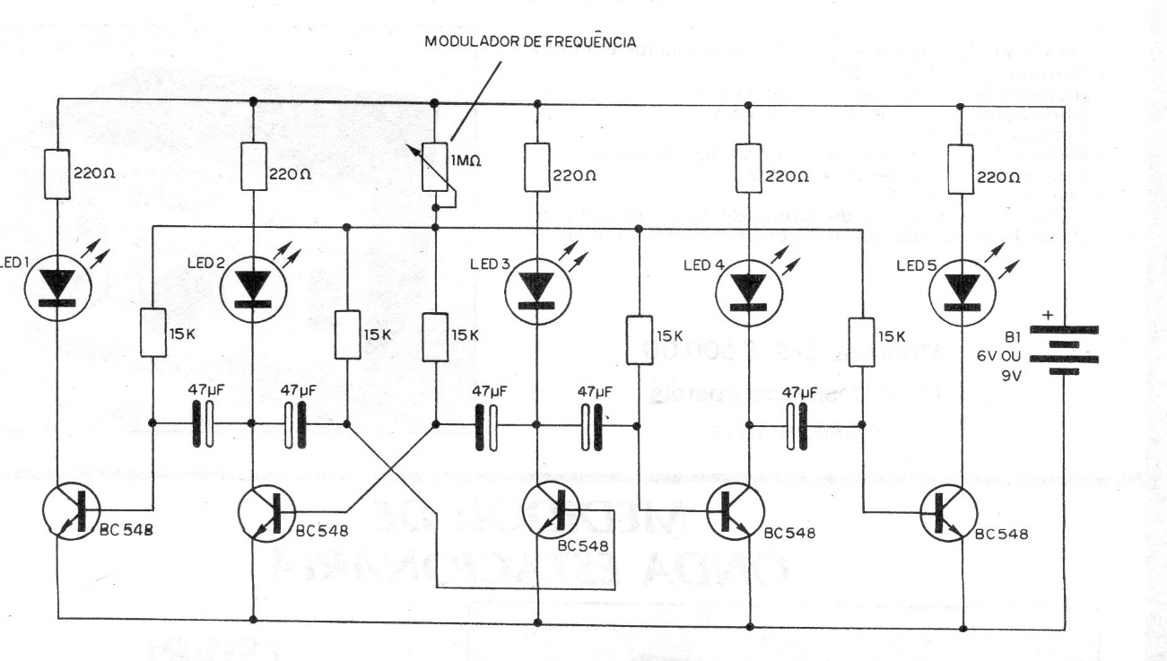 This simple circuit for experimental LED sequencing is based on a multivibrator with transistors. Adjustment of operation is done in the potentiometer and the supply can be made by voltages from 6 to 9 V.