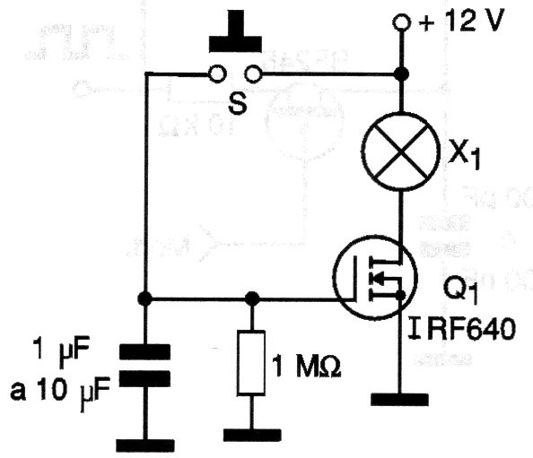 This version of time light with 12 V lamp and power MOSFET was found in a 2001 publication. Other versions can be found on the website. If the lamp has a current greater than 500 mA, MOFET must have a heat sink.