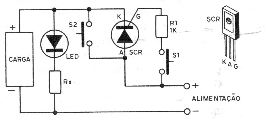 This 1977 circuit is a simple and straightforward application of an SCR, already explored in many articles on this site. The circuit locks when you press S1 for an instant. The circuit can be used with loads from 6 to 12 V, remembering that there is a voltage drop of about 2 V in the SCR.
