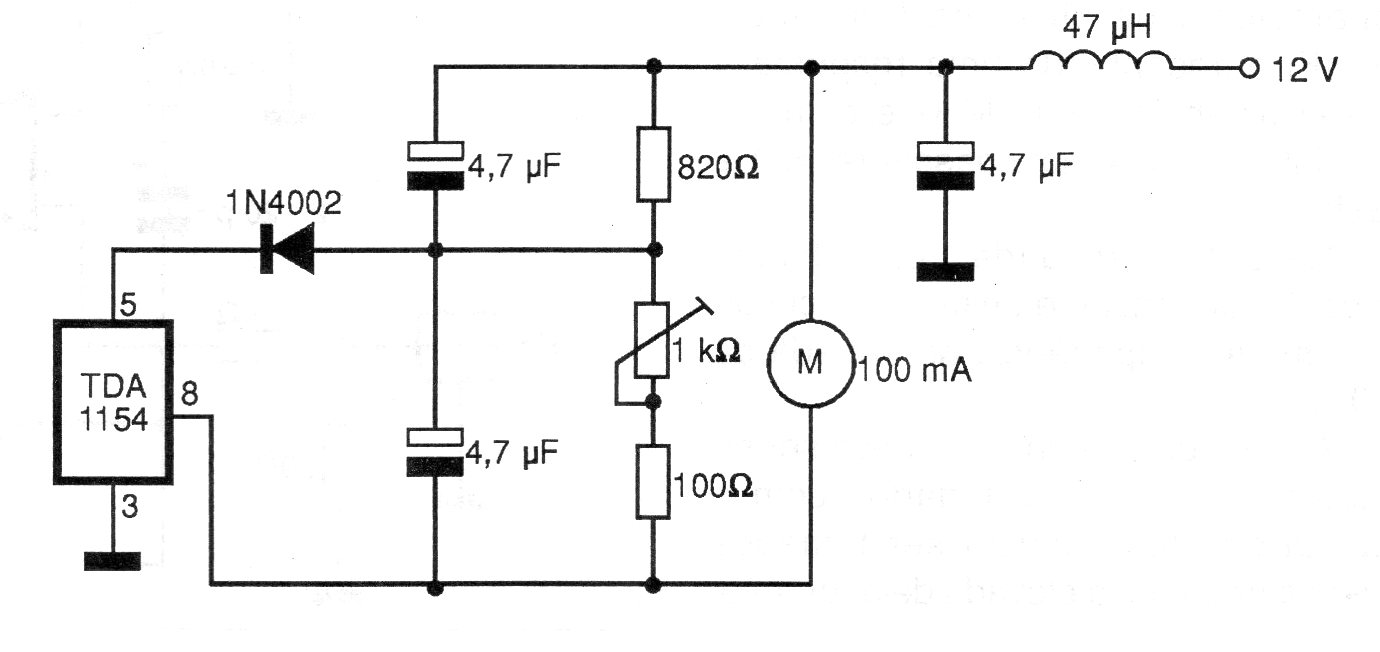The purpose of this circuit is to keep the speed of a small 100 mA direct current motor constant. The integrated circuit used is not very common today, as the circuit is from 1999, and the speed adjustment is done by a trimpot. The maximum output current of the integrated circuit is 1.2 A, and the maximum voltage is 20 V.