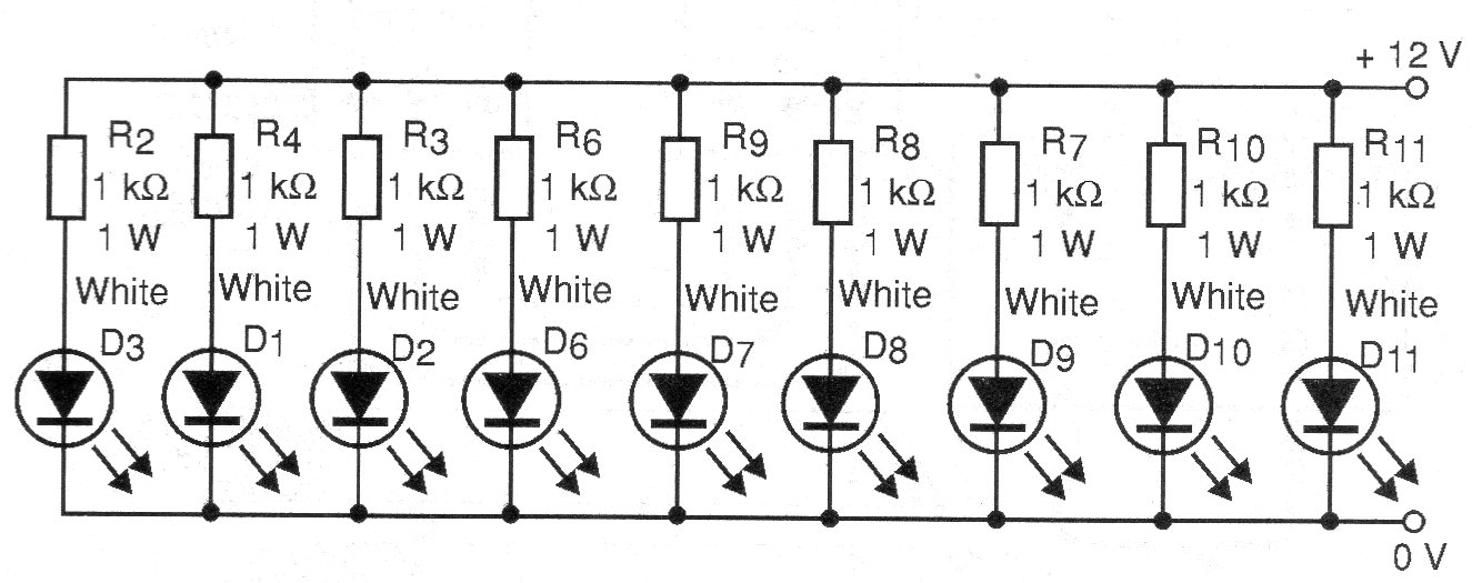 The circuit shown is a low-power LED flashlight. The LEDs are white with a current of 20 mA, and the circuit can be powered with voltages from 6 to 12 V. For lower voltages, reduce the resistors. Total consumption will depend on the number of LEDs used and the supply voltage. Today there are high-power white LEDs, some of them even with built-in resistors. If the reader finds these LEDs in his locality, this project can be greatly simplified. (2009)