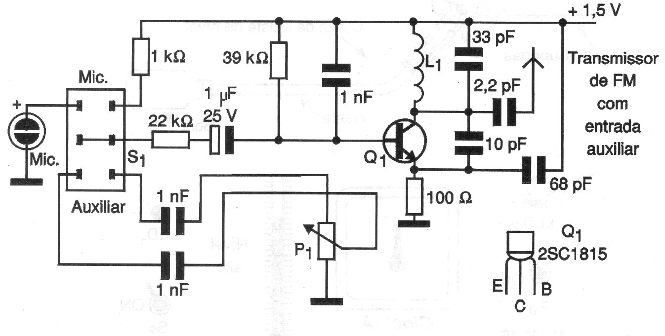 This circuit is from 2001 documentation and consists of a small FM transmitter with two inputs, one for the microphone and the other for an external signal source. The coil consists of 4 turns of 26 or 24 wire in the form of 1 cm without core and the supply can be made with voltages of 1.5 or 3 V. The non-polarized capacitors must be ceramic.
