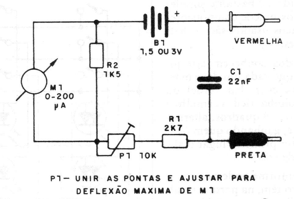 This is a very simple continuity tester, powered by one or two batteries of any size. The adjustment of the full scale for the instrument used is made in P1. The original instrument is a common 0 to 200 uA microammeter.
