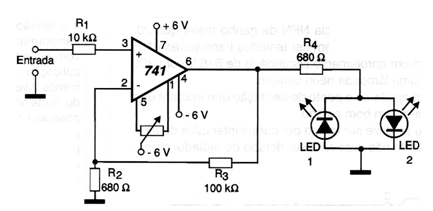 This circuit indicates the polarity of a voltage applied to the input. The circuit can make use of other operational ones and the input voltage can be in a range of -12 to +12 V. The circuit has a very low consumption. The resistor R3 determines the gain of the circuit and can be changed.