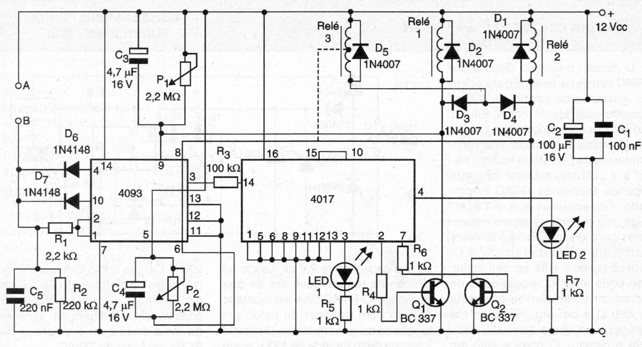 We found this circuit in a 2005 documentation. The circuit allows the automation of a gate through relays without the use of limit switches. The activation is done by switches placed between A and B. The circuit must be powered by a 12 V power supply. The opening and closing times are set in P1 and P2.