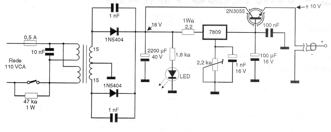This circuit is from 1997 when Camcorder-type video cameras that used powerful batteries were still very common, given the consumption. Some of these cameras are still used today, although they tend to disappear because digital cameras are taking their place. The circuit shown is a source for these cameras, although it can be used in other applications. The transformer is 15 + 15 V with 3 A.