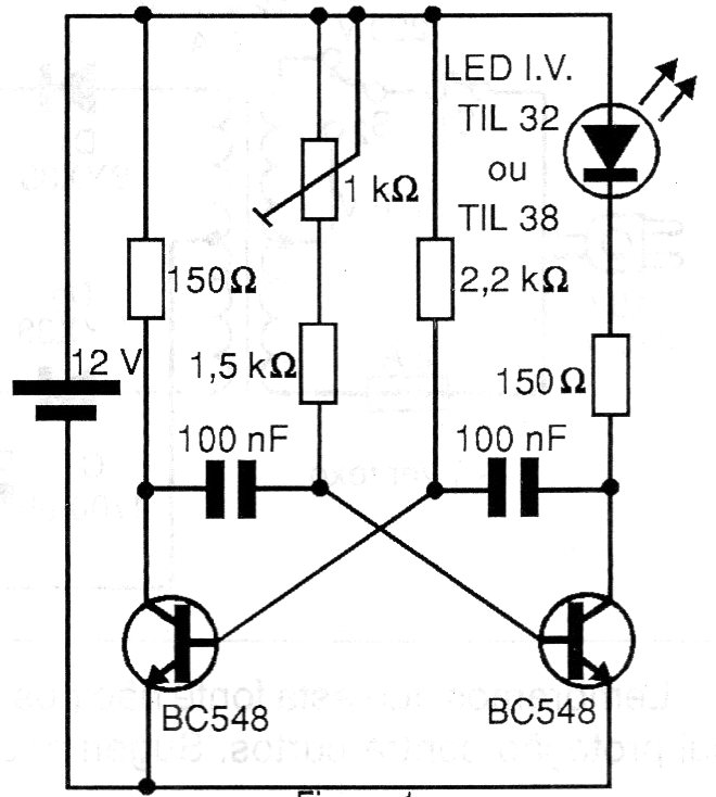 This circuit is for the system that has the receiver CB17134E. The emitting LED must be installed in a tube with a lens, for greater directivity and range. The circuit is adjusted in a trimpot and can be powered by a 12 V battery of the type used in commercial remote controls.