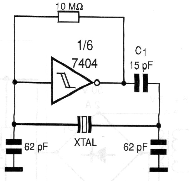 This oscillator can be found in other articles on the site. This is from a 4 MHz documentation, remembering that the power must be powered by a voltage of 5 V. The signal is obtained at the output pin of the inverter and is square. Other frequencies crystals can be used.