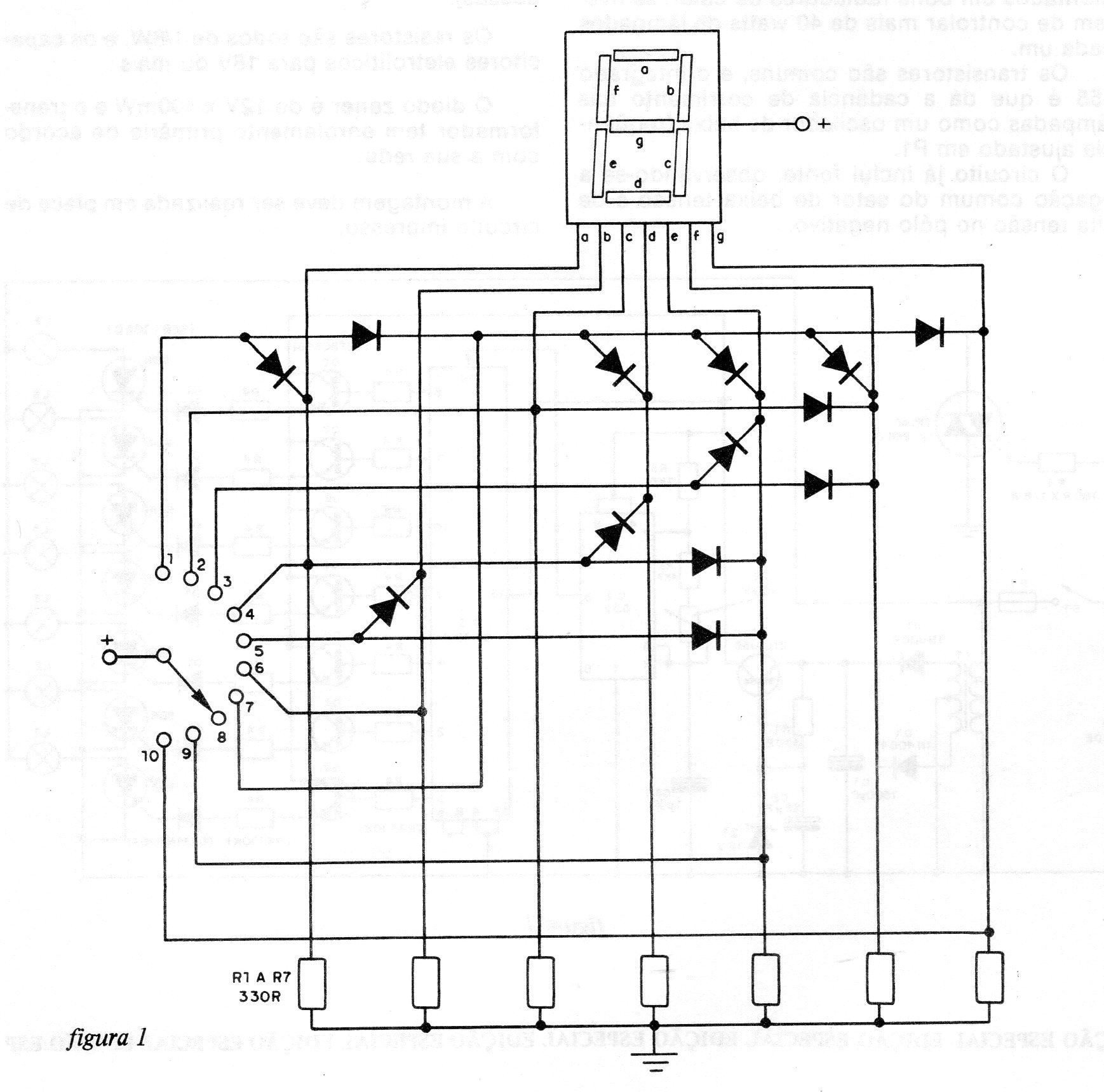 This didactic circuit makes the sequential activation from 0 to 10 to demonstrate the functioning of a 7-segment display. The supply is 5 or 6 and the diodes can be 1N4148 or any general-purpose type.