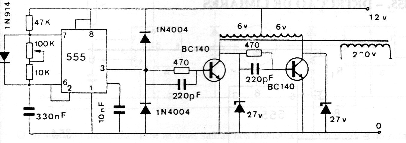 The power of this converter is not the greatest, it can only supply small fluorescent lamps, shavers, etc. The transformer has a primary of 220 V or 110 V and a secondary of 6 + 6 V with a current of around 500 mA. Transistors must be provided with heat sinks. Transistors can be modern equivalents like TIP31.
