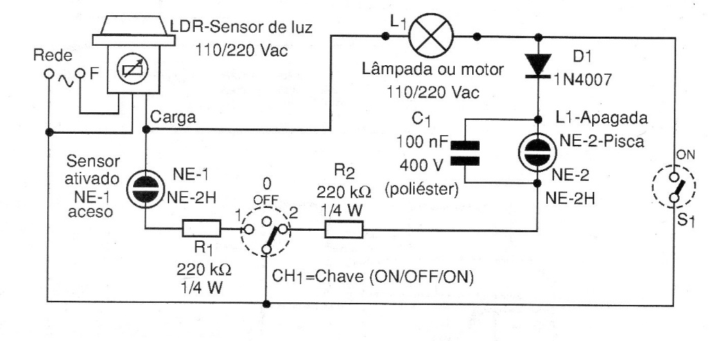 The purpose of this circuit presented in a 2009 documentation is to monitor, by means of neon lamps, indicators of the operation of a load, that is, one or a group of lamps or motor, located at a distance from the point where the command is activated. The power (W) and voltage of the light sensor (LDR) must be observed. This monitoring is operated on the CH-1 switch. As the circuit is designed to work in the absence of light (night), when the sensor trips, an internal relay closes its contact, providing conditions for the circuit to function. Switch S1 must be in the ON position if switch CH-1 is in position 1, with this the neon lamp NE-1 lights up indicating sensor activated and NE-2 remains off. When CH-1 is in position 2, NE-2 lights up, but if S1 is turned off, the L1 lamp goes out or the engine turns off and NE-2 flashes, alerting for the load to be deactivated. For 110 Vac network operation, the R1 / R2 resistors are reduced to 150 k ohms.