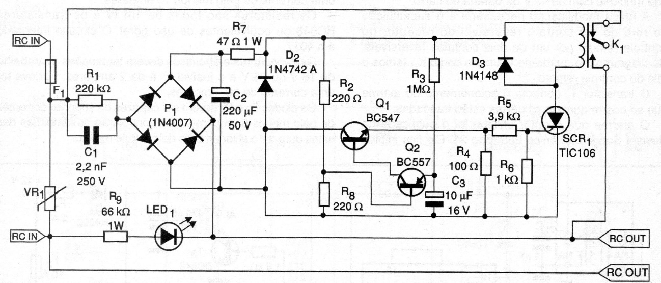 This circuit time the activation of appliances and electronics when the power is cut, thus avoiding the return transients. The circuit uses a source without a transformer and drives a 12 V relay. The relay contacts must have currents according to the load.