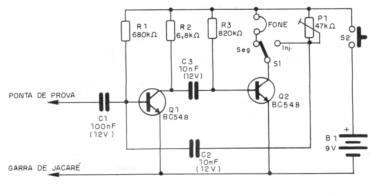This simple configuration can be found in other articles on this site. The phone used must be high impedance magnetic or a crystal capsule with a 4k7 resistor in parallel. The circuit is powered by a 9 V battery and the switch switches the function to injector with the frequency set in P1.