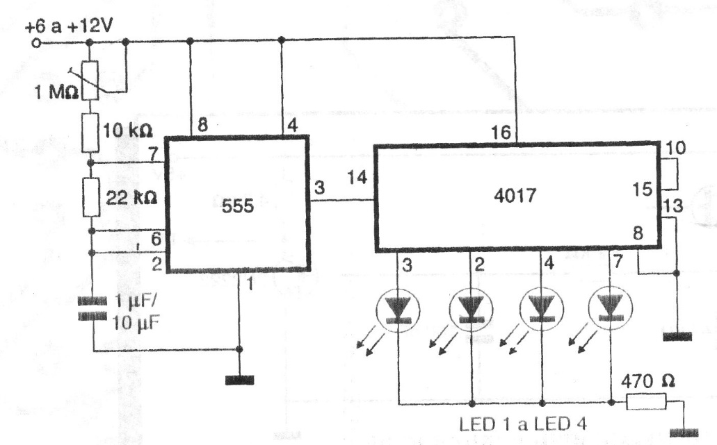 This conventional 4017 sequential circuit has appeared several times in our articles and on this website. This version is from 1997, and can be supplied with voltages from 5 to 12 V. An application is like a shield and the frequency of the effect discharge is adjusted in P1. Triggering by a microcontroller can be done from pin 4 with a total supply of 5 V.