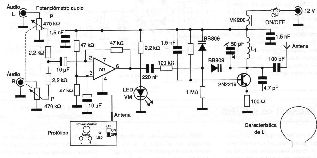 This circuit transmits the sound signals from a television or amplifier to an FM receiver at up to 50 meters. The signal is not multiplexed. L1 consists of a single loop of wire 18 without a core. The power must come from a 12 V source with excellent filtering so that no snoring occurs.